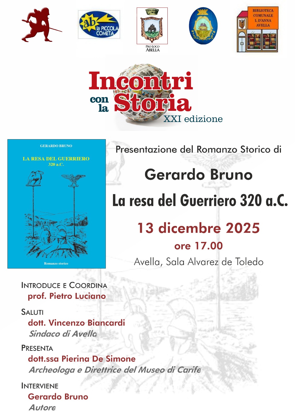Nuovo appuntamento con la cultura ad Avella, dove sabato 13 dicembre 2025, alle ore 17.00, si terrà la presentazione del romanzo storico “La resa del Guerriero. 320 a.C.” di Gerardo Bruno. L’iniziativa rientra nella XXI edizione di “Incontri con la Storia” e si svolgerà presso la Sala Alvarez de Toledo.