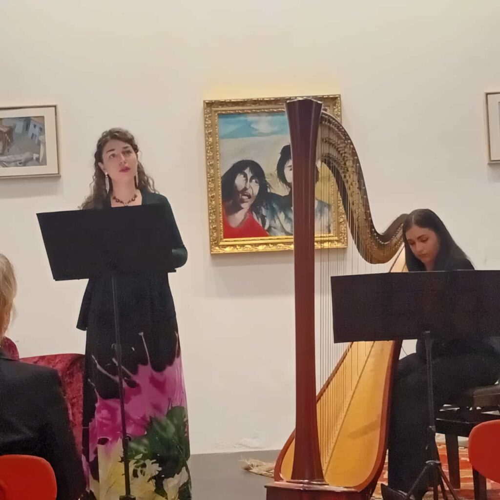 Soprano e arpa, voce e musica, potenza e sensibilità, le due giovani artiste hanno appassionato il pubblico con la loro elegante esibizione, emozionandolo con le tante possibilità che l’intreccio timbrico dell’arpa e della voce possono offrire. Entrambe le musiciste si sono diplomate al Conservatorio San Pietro a Majella di Napoli e perfezionatesi, ciascuna nel proprio stile, hanno tenuto numerosi concerti sia in duo che come soliste, spaziando dalla musica antica a quella da camera, dall’opera al folklore anche europeo, dal Barocco al Novecento. La serata, che rientra nell’ambito della rassegna “serate armoniche”, ideata dalla Direttrice Artistica musicale Maria Sirignano, ha conquistato il cuore degli spettatori, che hanno risposto con entusiasmo e partecipazione.