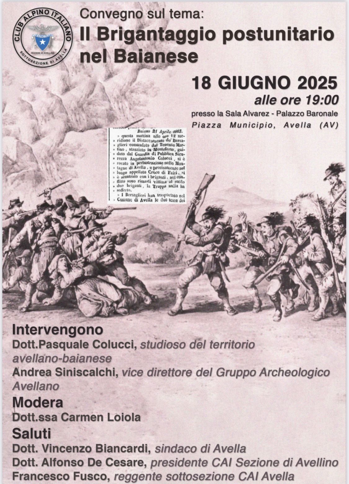 Mercoledì 18 giugno 2025, alle ore 19:00, la Sala Alvarez del Palazzo Baronale di Avella accoglierà il convegno “Il brigantaggio postunitario nel Baianese”, un appuntamento culturale di grande valore storico e identitario.