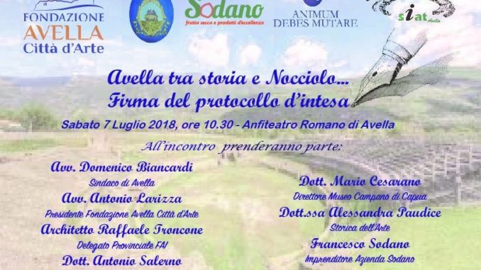 L’ideazione e la realizzazione di progetti comuni nei settori della valorizzazione, tutela e promozione del territorio, sono le finalità alla base del protocollo d’intesa tra la Fondazione Avella Città d’Arte e l’Azienda Sodano, che sarà firmato il giorno sabato 7 luglio 2018, alle ore 10.30, presso l’Anfiteatro Romano di Avella. L’accordo tra la Fondazione Avella Citta’ d’Arte e l’Azienda Sodano consentirà di definire ed attuare, in partnership, attività di intervento volte alla promozione, salvaguardia e sviluppo del patrimonio storico, culturale e gastronomico di Avella.