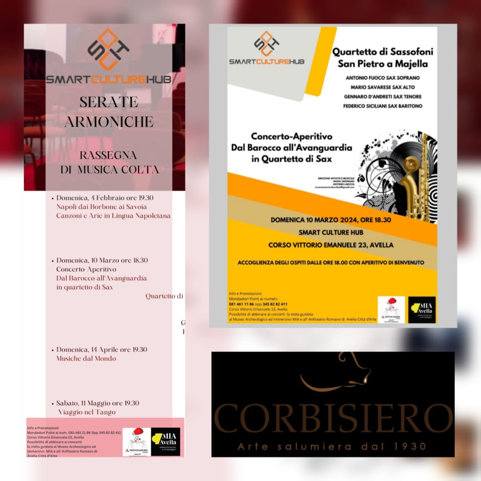 Dopo il successo del primo appuntamento in musica, prosegue la Rassegna concertistica “Serate Armoniche”,promossa dallo Smart Culture Hub di Avella. Il secondo appuntamento in programma è previsto per Domenica 10 marzo alle 18.30. Il concerto presenterà una varietà di brani che attraverseranno epoche e stili musicali, spaziando dal Barocco all’Avanguardia, eseguiti dal talentuoso Quartetto di Sax del Conservatorio San Pietro a Majella di Napoli. Si esibiranno: Antonio Fuoco al Sax Soprano, Mario Savarese al Sax Alto, Gennaro D’Andretti al Sax Tenore e Federico Siciliani al Sax Baritono. Il concerto sarà un’opportunità per gli appassionati di musica e per chi desidera immergersi in sonorità coinvolgenti, ma non solo. L’evento inizierà alle ore 18.00 con un aperitivo di benvenuto e la degustazione degli ottimi prodotti offerti dalla nota azienda di Salumi “Corbisiero” di Mugnano del Cardinale. Per informazioni e prenotazioni rivolgersi alla Mondadori Point di Avella in corso Vittorio Emanuele, oppure contattare i numeri: ▪ 345 82 82 411 ▪ 081 461 1186 La Rassegna Concertistica “Serate Armoniche” si conferma come un’occasione unica per vivere l’arte della musica in un contesto avvincente e ricco di emozioni, promettendo un’esperienza indimenticabile per tutti gli appassionati che interverranno. Allo Smart culture hub di Avella, musica, arte e cultura si fondono per rendere unico e prestigioso un appuntamento che esalta le eccellenze del territorio. Possibilità di associare al concerto- aperitivo la visita guidata al Museo Immersivo “Mia” di Avella.
