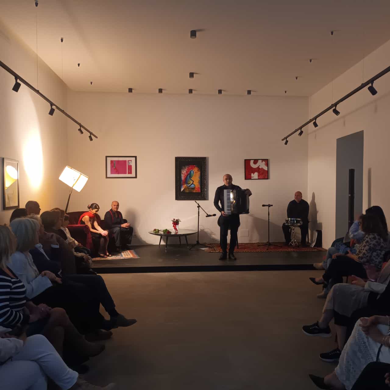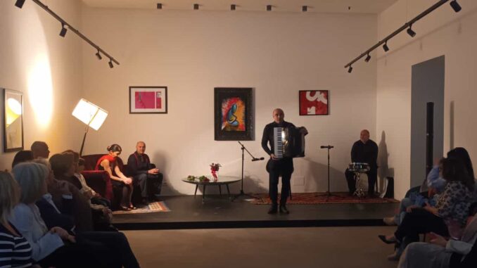 Ultima appuntamento “viaggio nel tango”, con il gruppo “Media Luz Tango”, composto dall’immenso Claudio Patuto alla fisarmonica, dal talento di Patrizio Paladino alle percussioni e dai ballerini Carmela Caseria e Pierpaolo Calandro, che con la loro eleganza e raffinatezza rappresentano un unicum nell’attuale panorama musicale italiano ed hanno letteralmente ammaliato il pubblico in sala.