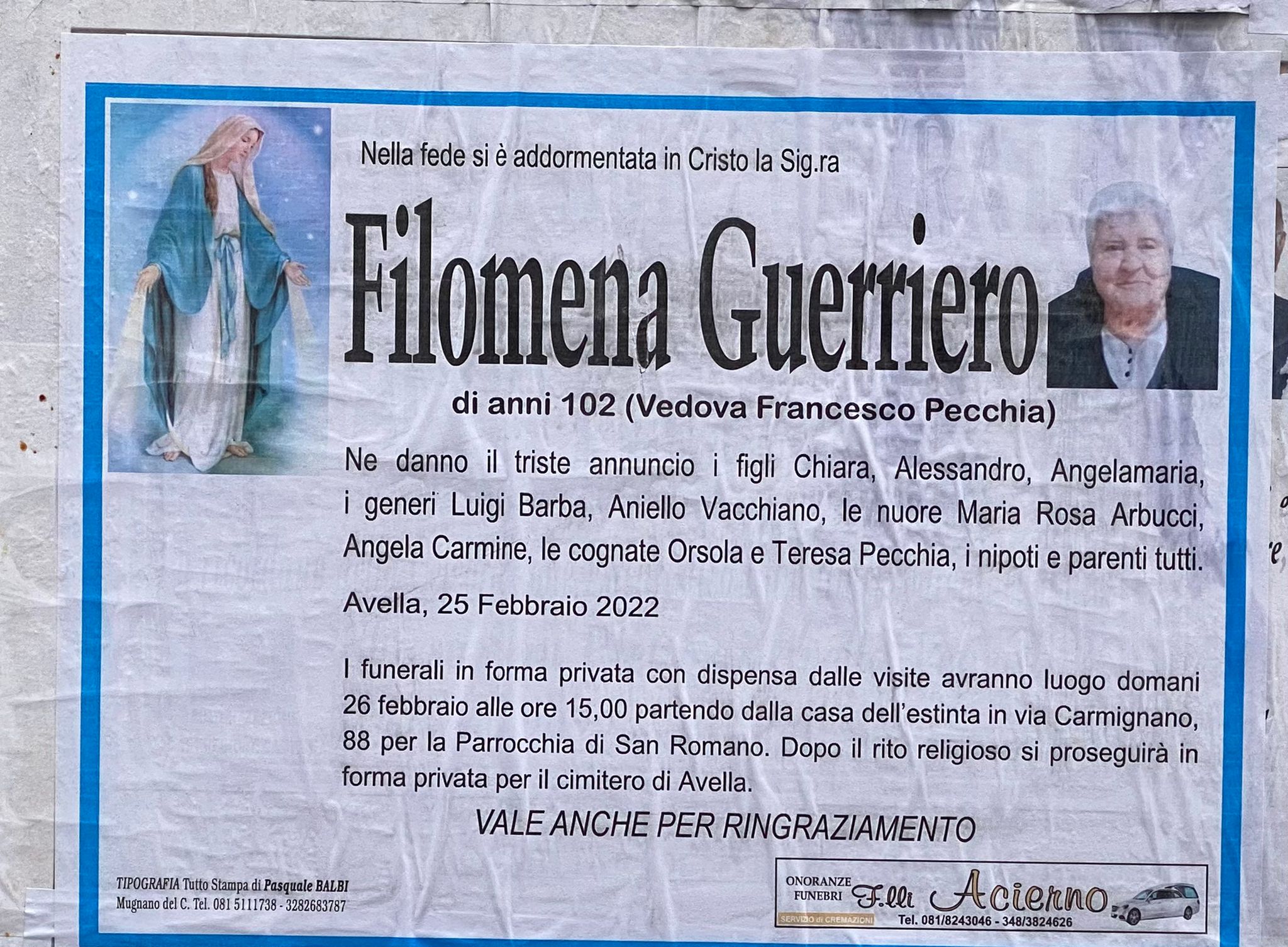 Fu festa grande in via Carmignano ad Avella il 20 gennaio del 2020, dove abitava la signora Filomena Guerriero. Nonna Filomena era una delle poche centenarie della cittadina archeologica  Quel giorno, eravamo ancora prima dello scoppio della pandemia,  il primo cittadino Domenico Biancardi  gli tributo  personalmente gli auguri dell’amministrazione, in quella occasione c’erano anche le nostre telecamere, (clicca qui per rivedere il video) presente anche il parroco Don Giuseppe Parisi che insieme ad amici e parenti, giunti in paese anche da paesi lontani, vollero  tributare gli auguri speciali. Purtroppo nella serata di ieri il suo cuore si è fermato. Ai parenti, in  particolare i figli Chiara, Alessandro, Angelamaria,  le più sentite condoglianze da parte di Binews. I funerali si svolgeranno oggi 26 febbraio 2022 a partire dalle ore 15 nella Chiesa di San Romano.