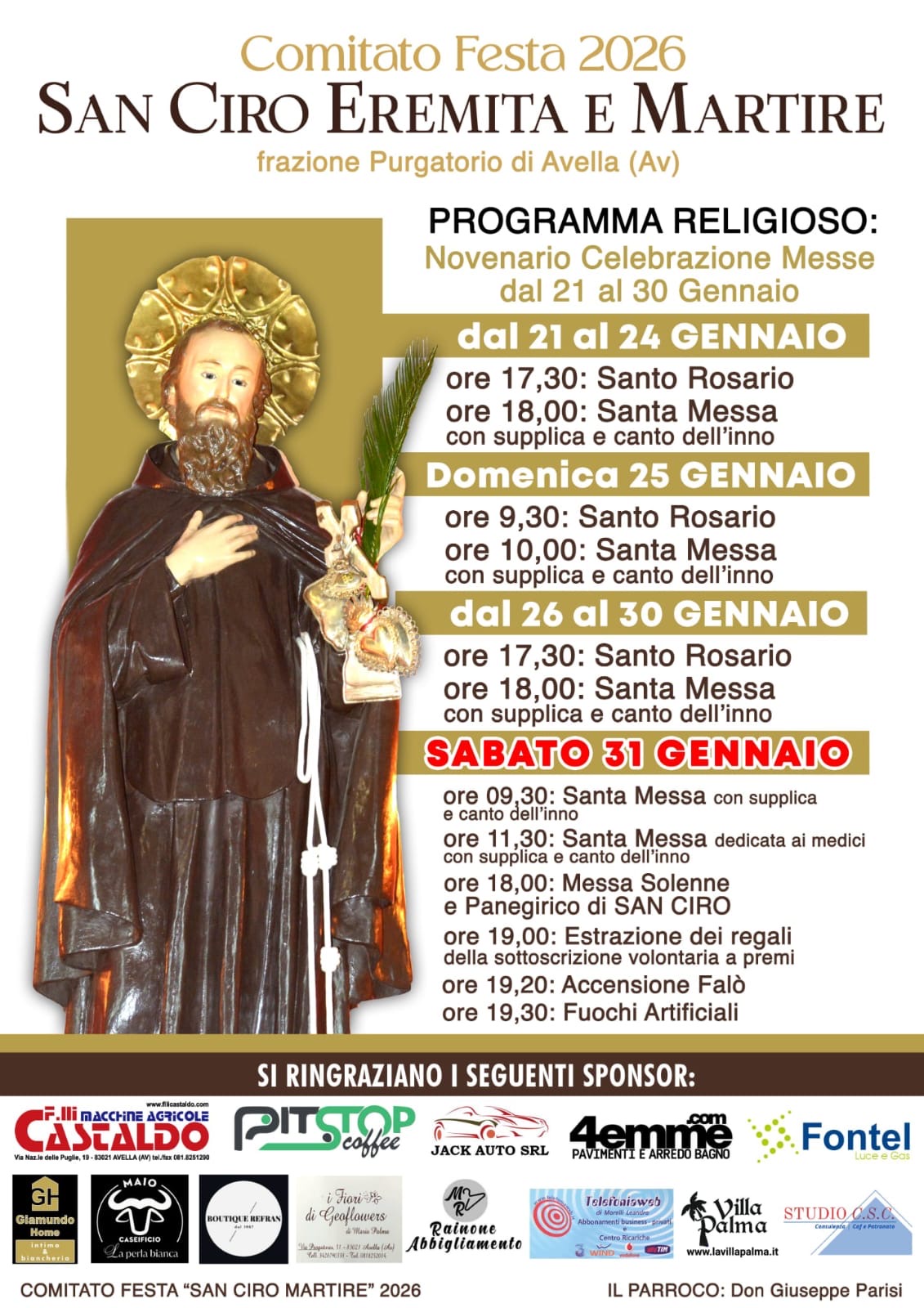 La comunità della frazione Purgatorio di Avella si appresta a vivere uno dei momenti più sentiti dell’anno con la Festa di San Ciro Eremita e Martire 2026, appuntamento che unisce devozione religiosa, tradizione popolare e forte senso di appartenenza.