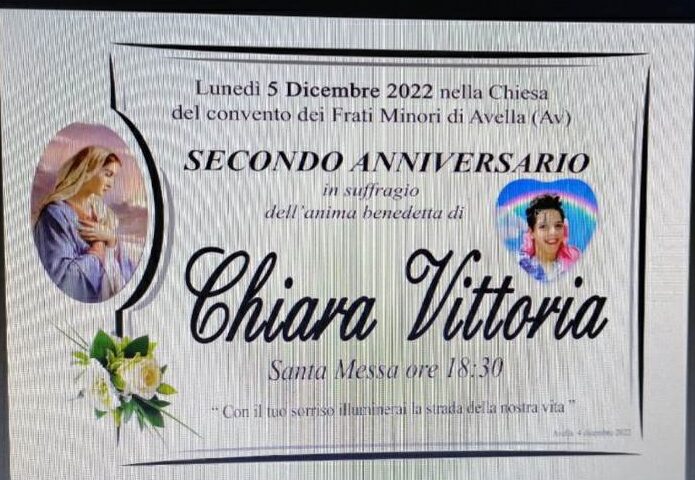 Chiara Vittoria è stata la più giovane vittima dell’emergenza Covid in tutta l’Irpinia. La sua morte commosse una comunità intera, non solo quella avellana, ma tutta l’Irpinia. Anche i medici che la tenevano in cura presso il Moscati di Avellino rimasero sconfortati dalla impossibilità di salvargli la vita. A due anni esatto dalla sua scomparsa, domani 5 dicembre 2022 alle ore 18,30 presso la Chiesa del Convento dei Frati Minori sarà celebrata una Santa Messa in sua memoria,AVELLA. Si ricorda Chiara Vittoria a due anni dalla scomparsa. Fu la più giovane vittima del Covid in Irpinia