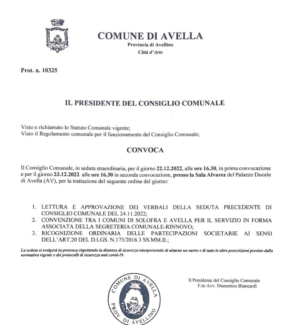 AVELLA. Si riunisce il Consiglio Comiunale 21/12/2022 binews.it ATTUALITA', AVELLA, EVIDENZA 0 Il giorno 22 dicembre 2022 alle ore 16,30 presso la Sala Alvarez del palazzo Baronale è stato convocato il consiglio comunale. Ecco i punti all’ordine del giorno nel lettera di convocazione allegata