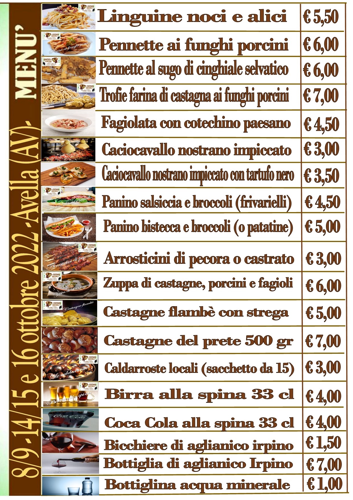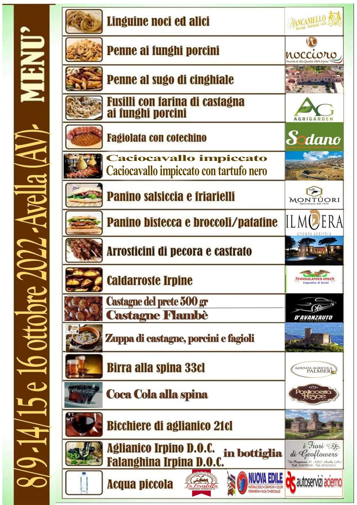 Per tutta la durata della Sagra della Castagna e della Nocciola, mercatino artigianale ed esposizione, degustazione e vendita di prodotti tipici irpini e campani (tra cui castagne, funghi, olio d’oliva DOP), con stand di aziende agricole della Regione. In più, in Piazza Municipio, degustazione di tanti piatti, rigorosamente innaffiati da ottimo vino irpino e birra artigianale, per stuzzicare il palato: linguine noci e alici, penne ai funghi porcini, penne al sugo di cinghiale, panino salsiccia e friarielli, fagiolata con cotechini, caldarroste, dolci di nocciola e castagne, noci, nocciole crude e tostate.