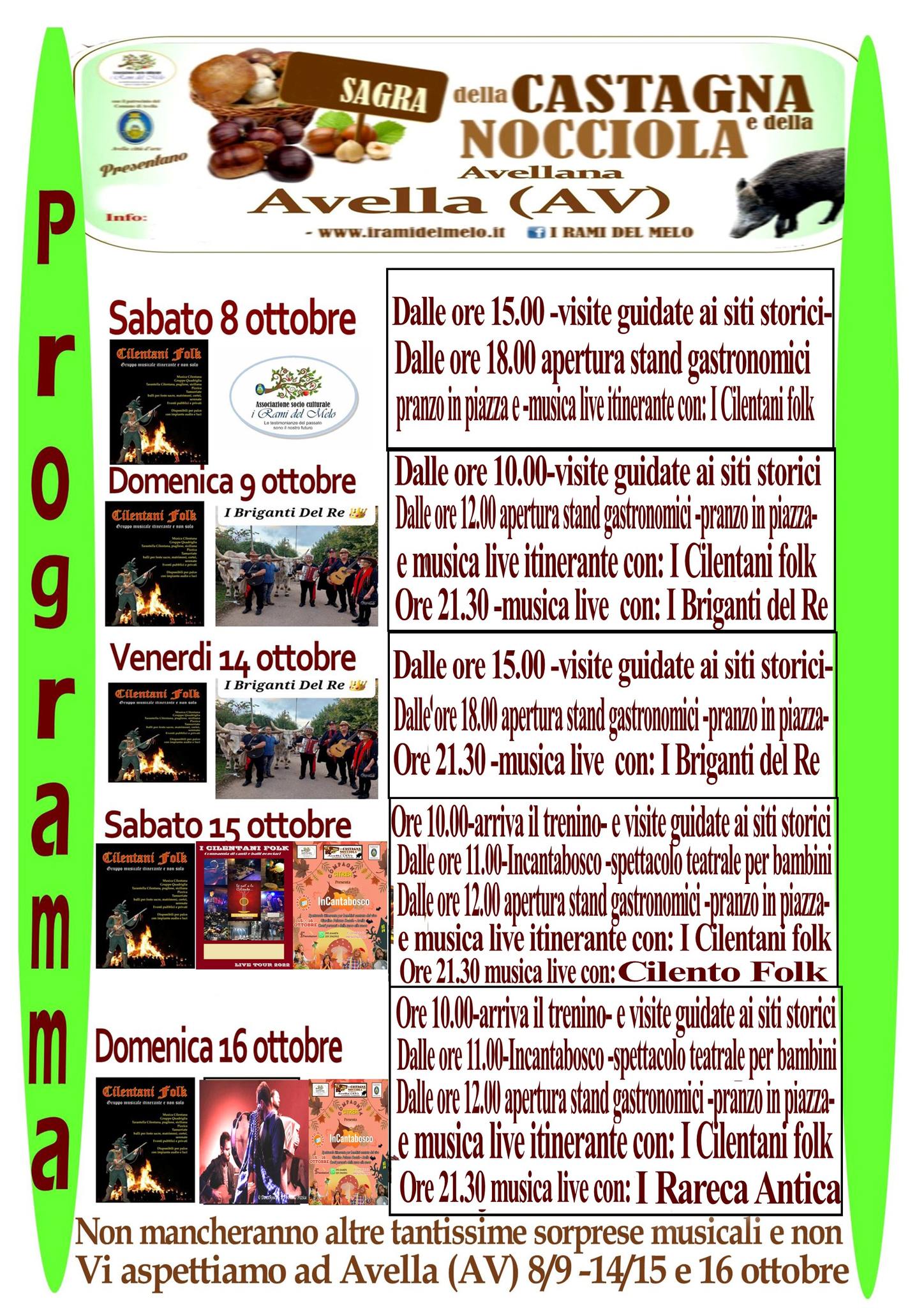 Cinque giorni ricchi di appuntamenti quelli che si terranno nel mese di ottobre nei giorni 8, 9 e 14, 15, 16 Ottobre 2022, dove  torna ad Avella  la Sagra della Castagna e della Nocciola, giunta alla 9a edizione e che riprende dopo due anni di stop forzato a causa della pandemia. Nelle passate edizioni la manifestazione ha portato in paese migliaia di visitatori che hanno potuto visitare le bellezze della cittadina archeologica e assaggiare le specialità offerte della sagra. Organizzata dall’associazione socio-culturale “I Rami del Melo” propone una celebrazione della lunga tradizione agricola avellana, la cui protagonista è, da sempre, la nocciola e le castagne delle verdi montagne irpine.