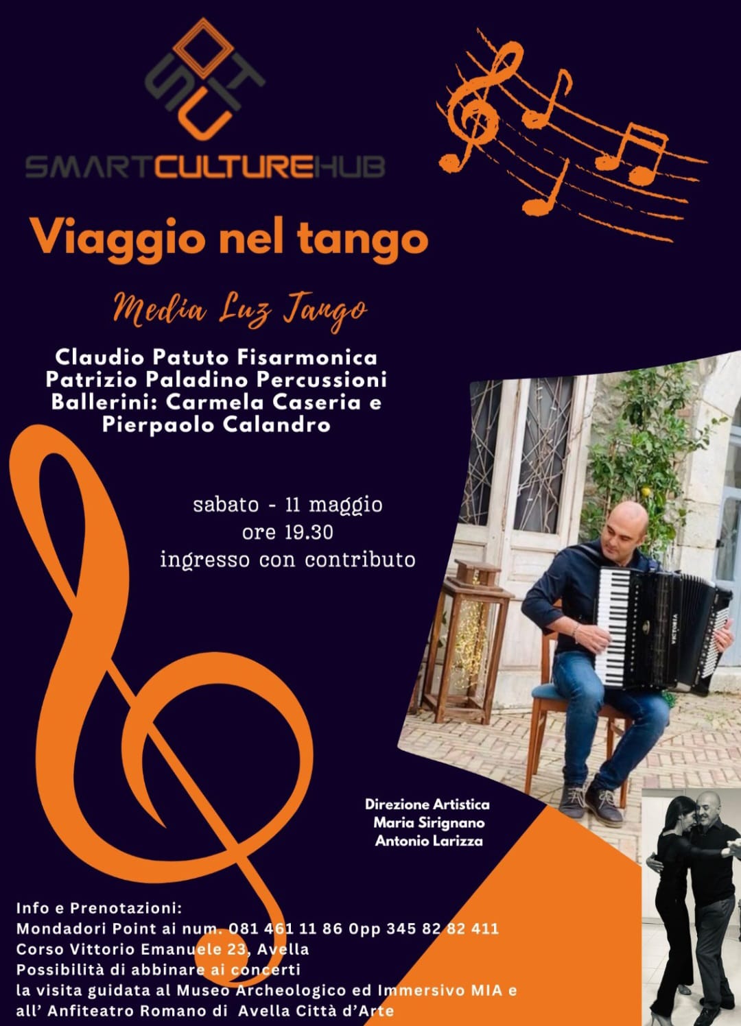 Sabato, 11 maggio, alle ore 19.30, presso lo Smartculturehub di Avella, si terrà l’ultimo concerto della rassegna “Serate Armoniche”, che ha conquistato il cuore degli spettatori, fin dal primo appuntamento in musica. Il concerto sarà dedicato ad un imperdibile Viaggio nel Tango eseguito dal gruppo “Media Luz Tango” che vede Claudio Patuto alla Fisarmonica, Patrizio Paladino alle Percussioni e in qualità di Ballerini Carmela Caseria e Pierpaolo Calandro. Info e Prenotazioni ai numeri in locandina. Possibilità di associare al concerto la visita al Museo Mia di Avella e all’ Anfiteatro Romano.