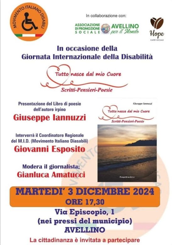 In occasione della Giornata Internazionale della Disabilità, martedì 3 dicembre ad Avellino si terrà un importante appuntamento dedicato all’inclusione e alla riflessione. Alle ore 17:30, presso il Caffè Sociale “Hope”, si svolgerà la presentazione del libro “Tutto nasce dal mio cuore”, scritto da Giuseppe Iannuzzi, un giovane di 34 anni diversamente abile originario di Santo Stefano del Sole.