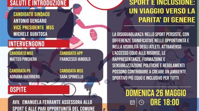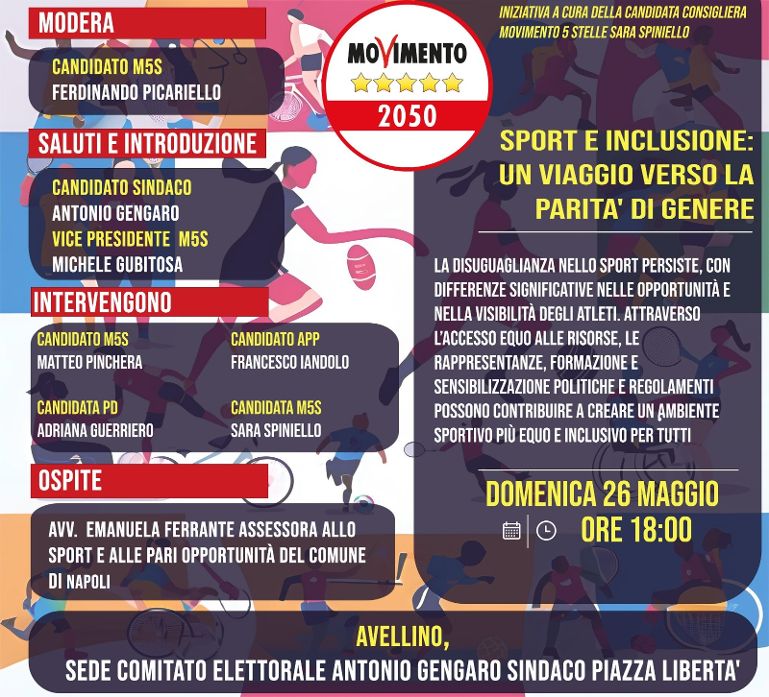 Domenica 26 maggio 2024, alle ore 18, presso la sede di Antonio Gengaro Sindaco in Piazza Libertà ad Avellino, si terrà un convegno dal titolo “Sport e inclusione: un viaggio verso la parità di genere”. L’iniziativa, ideata dalla candidata consigliere per il Movimento 5 Stelle Sara Spiniello, vedrà la partecipazione di ospiti illustri e personalità politiche di rilievo.