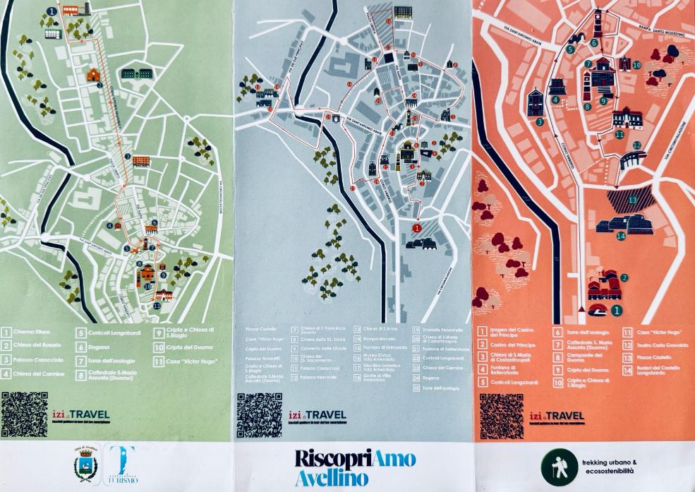 Il primo prevede l’attivazione di tre percorsi pedonali che mettono in rete i più importanti punti di interesse e i più affascinanti luoghi identitari della città. Con l’obiettivo ambizioso di coniugare, nel segno della sostenibilità e della mobilità dolce, un trekking urbano accessibile e le bellezze storico-artistico-architettonico del centro storico. Tre percorsi per tre colori: verde, azzurro e rosa. Impreziositi dall’inconfondibile tratto di matita dell’illustratrice avellinese, Gaia Guarino, e da un sapiente utilizzo delle nuove tecnologie: dall’ APP ai QR code, per rendere indimenticabile e facilmente fruibile ciascuno dei tre tour.