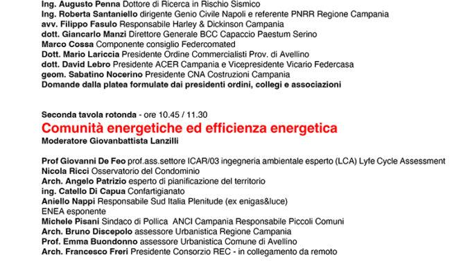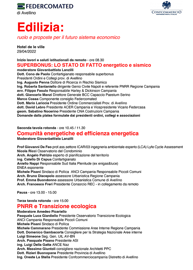 “Edilizia: ruolo e proposte per il futuro sistema economico” metterà a confronto autorevoli esponenti della politica, dell’edilizia, delle professioni e dei servizi, attorno ad argomenti di assoluta attualità quali il Superbonus 110%, le comunità energetiche, il Pnrr, la transizione ecologica e la nuova proposta di legge per la filiera edilizia.