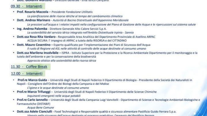 Spazio anche alla gestione del servizio idrico integrato con Andrea Palomba, direttore generale di Alto Calore Servizi, e agli aspetti legati alla qualità delle acque e alla sicurezza dei sistemi idrici con Rosa Rita Vardaro, responsabile Arpac, e Mauro Cosentino, esperto nella pianificazione dei Piani di Sicurezza dell’Acqua.