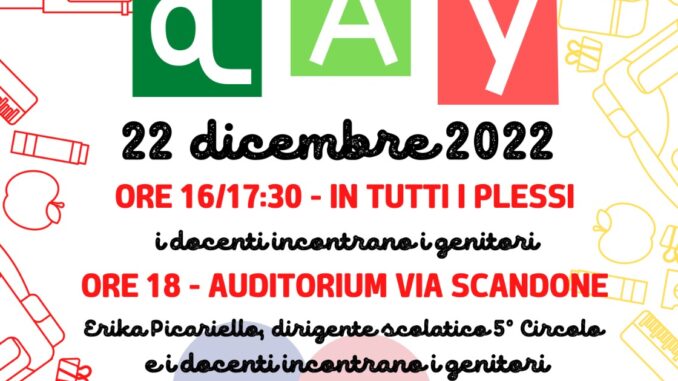 Dalle 16 alle 17:30 i docenti incontrano i genitori interessati presso tutti i plessi: Giovanni Palatucci in via Scandone ad Avellino, Umberto Nobile in via Oscar D’Agostino ad Avellino, Gianni Rodari in via Piave ad Avellino, Antonio Manganelli nel quartiere Picarelli ad Avellino, Rione Parco in via Rotondi ad Avellino, San Giovanni Bosco in via San Sebastiano a Capriglia Irpina.