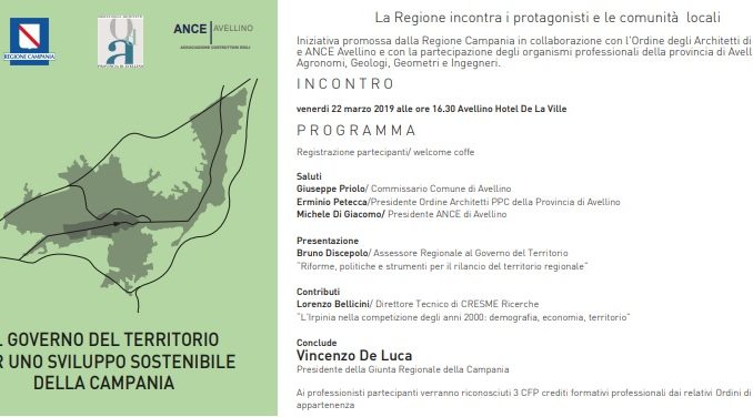 E’ il tema del convegno di studio, in programma domani, venerdì 22 marzo, all’Hotel de La Ville, ad Avellino, alle ore 16,30. E’ il primo appuntamento, promosso dalla Giunta regionale della Campania, nel quadro dell’agenda di analisi e riflessione sugli indirizzi di politica urbanistica per i territori, da sviluppare in un confronto aperto con le comunità locali e le loro rappresentanze istituzionali, le associazioni di categoria e professionali. Un percorso che interesserà gradualmente tutte le altre province della Campania e dell’area metropolitana di Napoli.