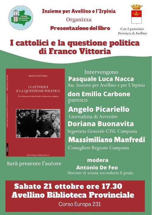 Il movimento “Insieme per Avellino e l’Irpinia” è lieto di presentare il libro di Franco Vittoria “I cattolici e la questione politica”, sabato 21 ottobre alle 17,30 alla Sala penta presso la biblioteca provinciale di Avellino.