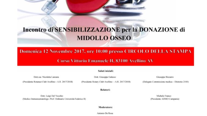 Cosa significa divenire donatore? Che tipo di impegno richiede? Cos’è e come si preleva il midollo osseo? Come avviene e a cosa serve il trapianto? Spesso la mancata conoscenza di ciò che effettivamente comporta la scelta della donazione può creare preconcetti o timori immotivati. Per rispondere a queste domande e dare il giusto peso a questa importante tematica, il Rotaract Club Avellino insieme all’ADMO Campania e al Rotary Club Avellino, ha organizzato la Giornata di Sensibilizzazione “Donatori di VITA”, che si terrà in data 12 Novembre 2017 dalle ore 10:30 alle 13:00, presso il Circolo della Stampa di Avellino. Alla Giornata parteciperanno Professionisti del settore e alti Dirigenti dell’ADMO Campania, la cui esperienza e professionalità potrà porre chiarezza su questo argomento, sia dal punto di vista dell’impegno personale e dell’iter burocratico e ospedaliero, sia dal punto di vista medico-scientifico.