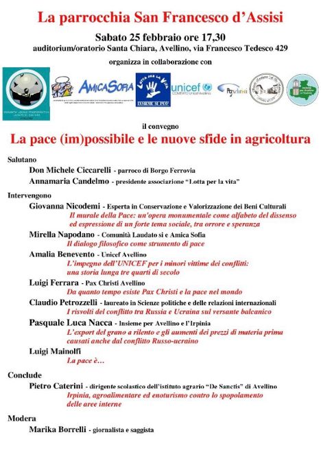 La parrocchia San Francesco di Assisi di Borgo Ferrovia ad Avellino, in collaborazione con la “Comunità Laudato Sii”, “Amica Sofia”, “Lotta per la vita”, “Unicef Avellino”, “Pax Christi”, “Insieme per Avellino e l’Irpinia” e l’istituto agrario “De Sanctis” di Avellino ha organizzato un convegno per sabato 25 Febbraio 2023 alle 17,30 presso l’auditorium/oratorio Santa Chiara, dal titolo “La pace (im)possibile e le nuove sfide in agricoltura”.