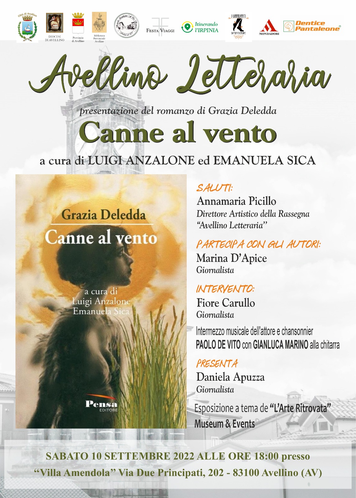 Nuovo appuntamento per la rassegna “Avellino Letteraria” ideata ed organizzata da Annamaria Picillo, direttore artistico dell’evento. Sabato 10 settembre alle 18, presso la storica dimora, Villa Amendola, sarà presentato il romanzo di Grazia Deledda, “Canne al vento”, a cura di Emanuela Sica e Luigi Anzalone. Grazia Deledda, premio Nobel per la letteratura, scrisse romanzi e racconti dalla vena etica in cui è descritta la dura vita quotidiana dei compaesani sardi. Un romanzo che si sviluppa intorno al tema della passione irrefrenabile che travolge e coinvolge l’uomo, ma che si eleva anche al mondo del mito, della leggenda e della magia. Partecipa con gli autori, la giornalista Marina D’Apice. Contributo del giornalista, Fiore Carullo. Interludio musicale dell’attore e chansonnier, Paolo De Vito, coadiuvato alla sonorità dal maestro Gianluca Marino, alla chitarra. Esposizione a tema de “L’arte Ritrovata” Museum & Events. Coordina l’evento la giornalista Daniela Apuzza.