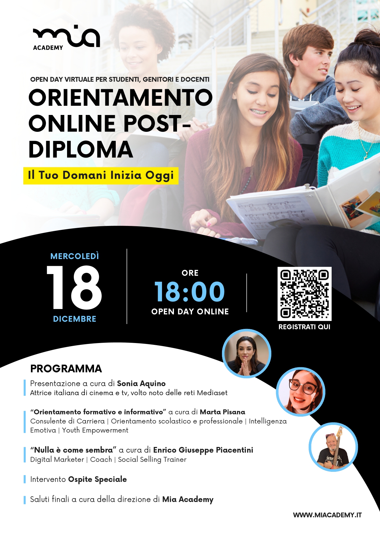 MIA Academy, scuola di formazione professionale all’avanguardia, annuncia un evento esclusivo dedicato all’orientamento post-diploma. L’Open Day Virtuale “Orientamento Online Post-Diploma – Il Tuo Domani Inizia Oggi” si terrà mercoledì 18 dicembre alle ore 18:00, offrendo un evento unico per diplomandi, famiglie e insegnanti di tutta Italia.