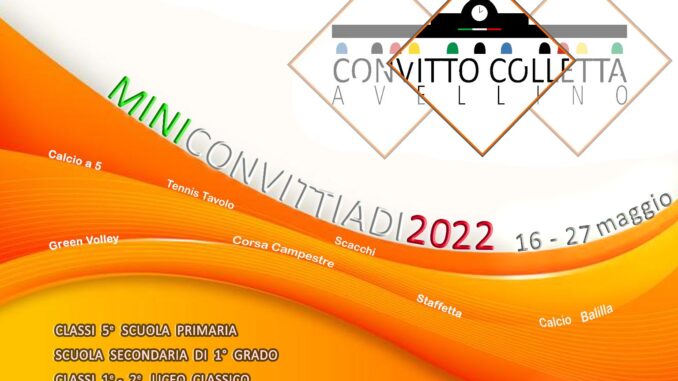 Il 16 maggio 2022 alle ore 15.00 al Convitto Nazionale Pietro Colletta di Avellino ci sarà la Cerimonia di apertura della manifestazione sportiva “MINICONVITTIADI 2022”. Gli alunni della scuola secondaria di 1° grado, delle classi quinte della scuola primaria e delle classi prime e seconde della scuola secondaria di 2° grado sono pronti a sfidarsi in un clima di sana competizione nelle diverse discipline sportive.