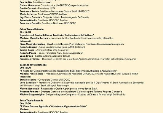 L’iniziativa, promossa dall’Unione Giovani Dottori Commercialisti ed Esperti Contabili di Avellino, rappresenta un’importante occasione di confronto sulle sfide e le opportunità legate alla transizione ESG (Environmental, Social and Governance) applicata alle imprese agricole e del vino, settori chiave per l’economia del territorio.