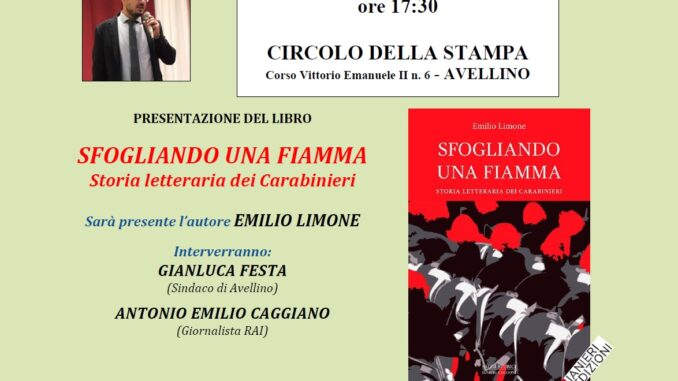 Sabato 13 novembre 2021 alle ore 17:30, presso il Circolo della Stampa di Avellino, sarà presentato il libro “Sfogliando una fiamma. Storia letteraria dei Carabinieri”, edito da Ianieri Edizioni. Interverranno il Sindaco di Avellino Gianluca Festa ed il giornalista RAI Antonio Caggiano, oltre all’autore Emilio Limone, maresciallo dei Carabinieri effettivo all’Ufficio Stampa del Comando Generale e giornalista pubblicista. Sarà la quarta tappa di un tour di presentazioni che si prevede lungo e toccherà più regioni d’Italia. L’autore di origini avellinese, pur avendo lasciato l’Irpinia da più di tre lustri, ha conservato intatto l’amore per la terra natia. In adolescenza ho collaborato con varie testate giornalistiche locali.