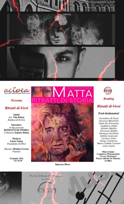 E’ in corso la personale dell’artista serinese, il Maestro Sabino Matta, dal titolo “RITRATTI DI STORIA” patrocinata dalla Regione Campania, Provincia di Avellino e dal Comune di Serino, inaugurata lo scorso 3 giugno, presso il Museo Irpino Complesso Monumentale Carcere Borbonico ad Avellino e resterà aperta al pubblico fino al 18 giugno ’22.