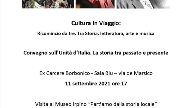 L’appuntamento si rinnova Cultura in viaggio. Ricomincio da tre: Storia, letteratura e musica. Sabato 11 settembre 2021 alle ore 17:00 presso l’Ex Carcere Borbonico, via de Marsico di Avellino, l’Associazione di promozione sociale “Il Bucaneve” terrà il secondo convegno sull’Unità d’Italia tra passato e presente, organizzato dalla presidente, Maria Ronca.