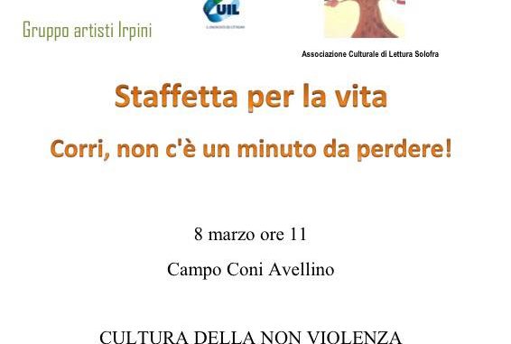 L’Associazione “Il Bucaneve”, presidente Maria Ronca in collaborazione con l’ Ufficio della consigliera di Parità regionale, Domenica Marianna Lomazzo e della provincia Di Avellino, Antonietta De Angelis, Uil, con Assessore alla Cultura Bruno Gambardella, Vincenza Preziosi UGL, AMDOS Montoro, Adelina Caliano, con Gruppo artisti irpini Pasquale Luca Nacca, Associazione Culturale Gruppo di lettura Solofra Gilda Parmigiano, organizza l’ 8 marzo ore 11, 00 presso il campo CONI di Avellino una corsa simbolica con bambini, ragazzi, donne e uomini, artisti, poeti, amministratori, consigliera di parità, referente dei sindacati.