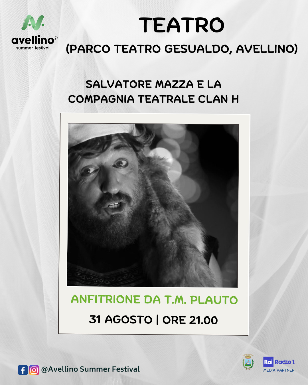 31 Agosto: Salvatore Mazza e la Compagnia Teatrale Clan H presenteranno “Anfitrione”, commedia di Plauto. L’Anfitrione (Amphitruo) è una commedia, in cinque atti e un prologo, scritta dall’autore latino Plauto. L’opera trae il titolo da uno dei protagonisti, il comandante dell’esercito tebano Anfitrione, mentre gli altri personaggi sono gli dei Giove e Mercurio, i mortali Alcmena e Sosia, rispettivamente moglie e servo di Anfitrione, oltre a due personaggi di contorno: il pilota Blefarone e la serva Bromia. Di solito le commedie rappresentavano fatti riguardanti personaggi popolari, non divinità o soggetti mitici, di cui si occupava invece la tragedia; per questo motivo lo stesso poeta definisce nel prologo, per bocca di Mercurio, la sua opera una tragicomoedia.