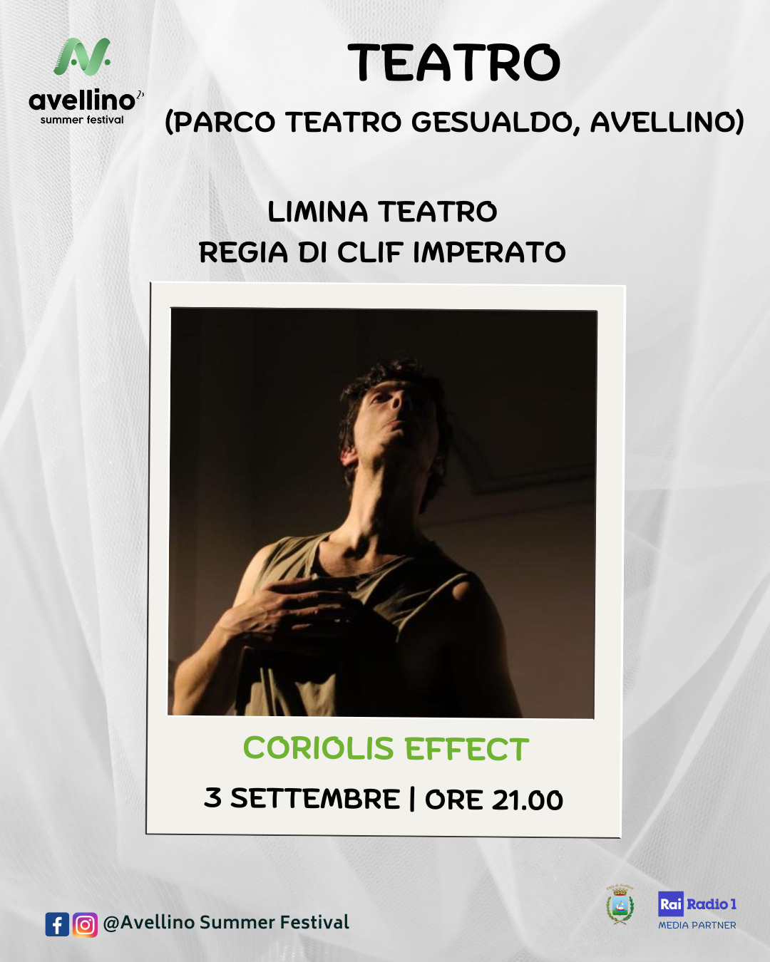 3 Settembre: Limina Teatro chiuderà la rassegna con “CoriolisEffect”, diretto da Clif Imperato, trucco di Francesca Lallo, un’opera che promette di essere tanto avvincente quanto intellettualmente stimolante.