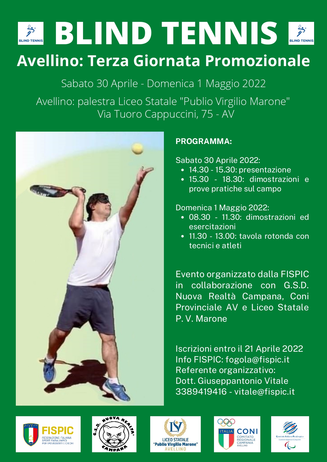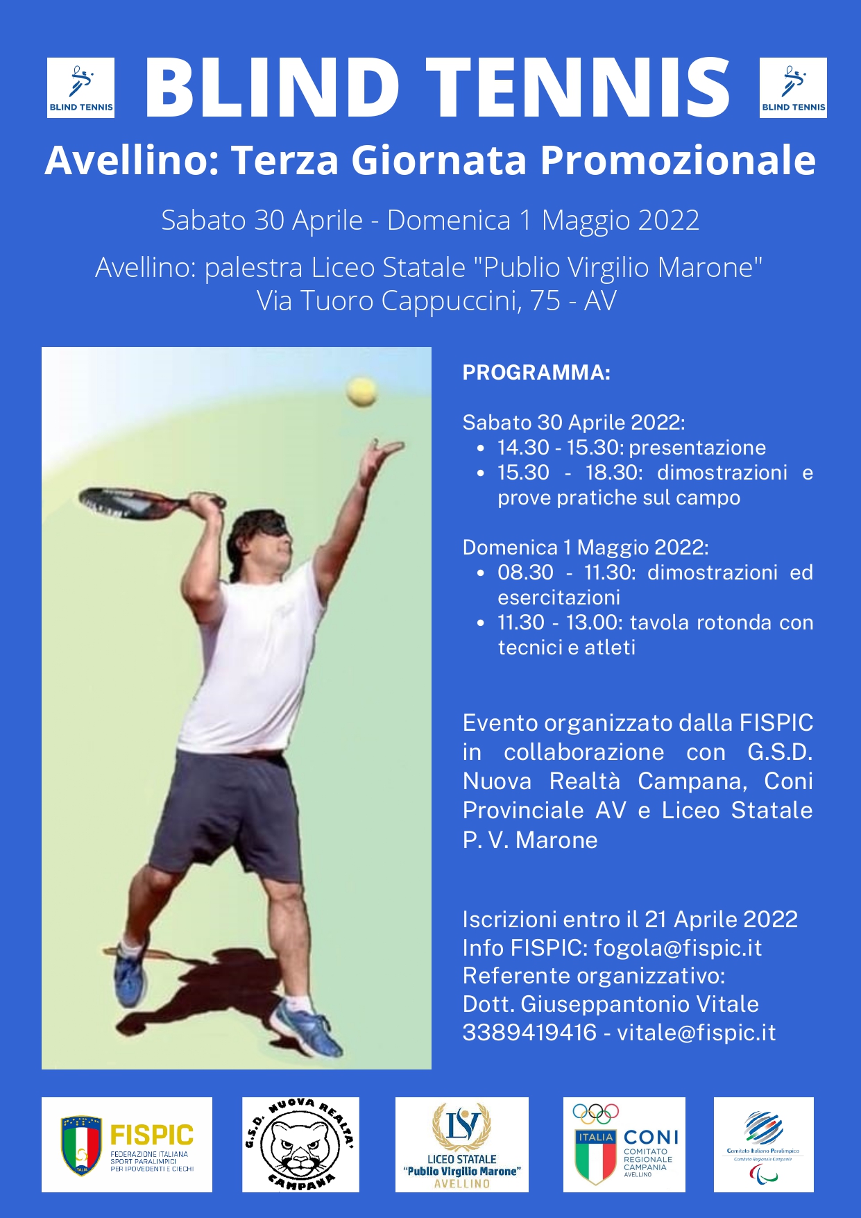 Nel quadro delle iniziative della FISPIC (Federazione Italiana Sport Paralimpici per Ipovedenti e Ciechi) si svolgeranno ad Avellino , presso la Palestra del liceo Publio Marone guidato dalla dirigente, Dott.ssa Lucia Forino, due giornate di promozione di Blind Tennis, sport innovativo per i non vedenti.