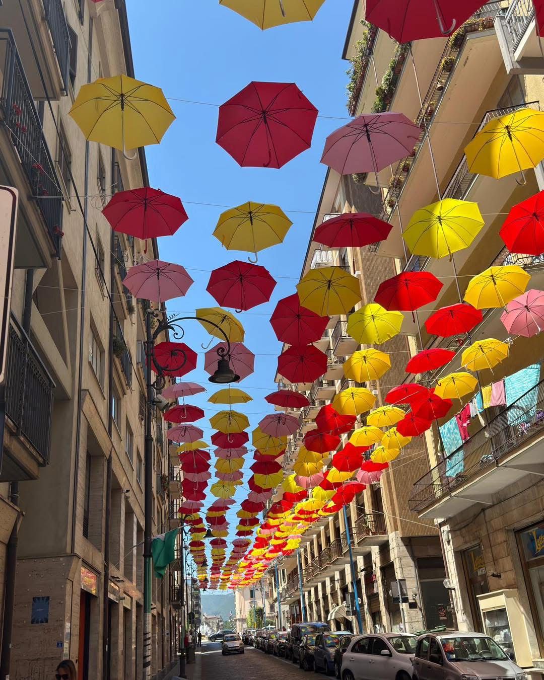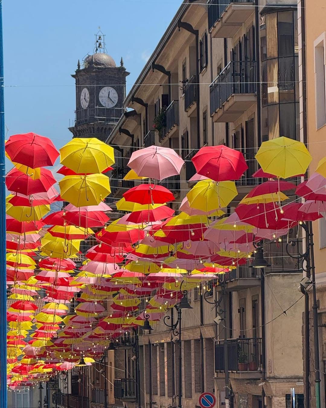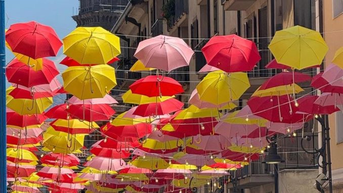 Un’esplosione di colori accoglie da oggi chi entra nel cuore antico di Avellino. Via Nappi, una delle principali porte d’accesso al centro storico, si trasforma in un suggestivo corridoio urbano grazie all’installazione di centinaia di ombrelli sospesi, in un gioco di luci e tonalità che abbraccia lo sguardo e l’anima.