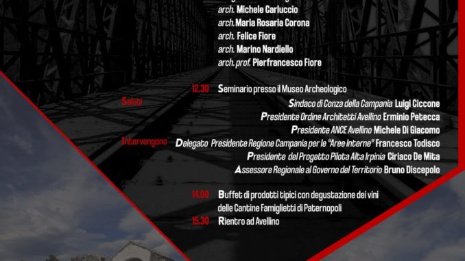 L’evento è stato organizzato dall’Ordine insieme alla Regione Campania, il Comune e la Proloco di Conza, l’Ance Costruttori di Avellino e l’associazione Inlocomotivi. La partenza è prevista alle ore 9,00 di sabato 23 novembre dalla stazione ferroviaria di Avellino.