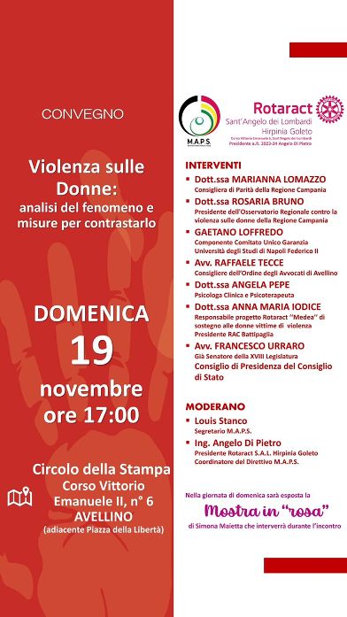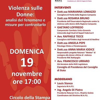 Incontro organizzato dall’associazione M.A.P.S. Movimento Attivo Politico e Sociale e dal Club Rotaract Sant’Angelo dei Lombardi Hirpinia Goleto Domenica 19 novembre alle ore 17:00 presso il “Circolo della Stampa” di Avellino, corso Vittorio Emanuele II, il club Rotaract Sant’Angelo dei Lombardi Hirpinia Goleto e l’associazione M.A.P.S. Movimento Attivo Politico e Sociale organizzano un momento di confronto sul fenomeno della violenza sulle donne.Durante l’incontro parteciperanno figure istituzionali e professionisti del mondo dell’associazionismo che illustreranno un’analisi dettagliata del problema e forniranno in base ai propri ruoli gli strumenti e le misure per contrastarlo.
