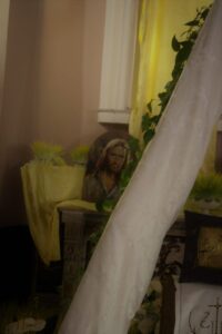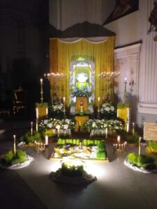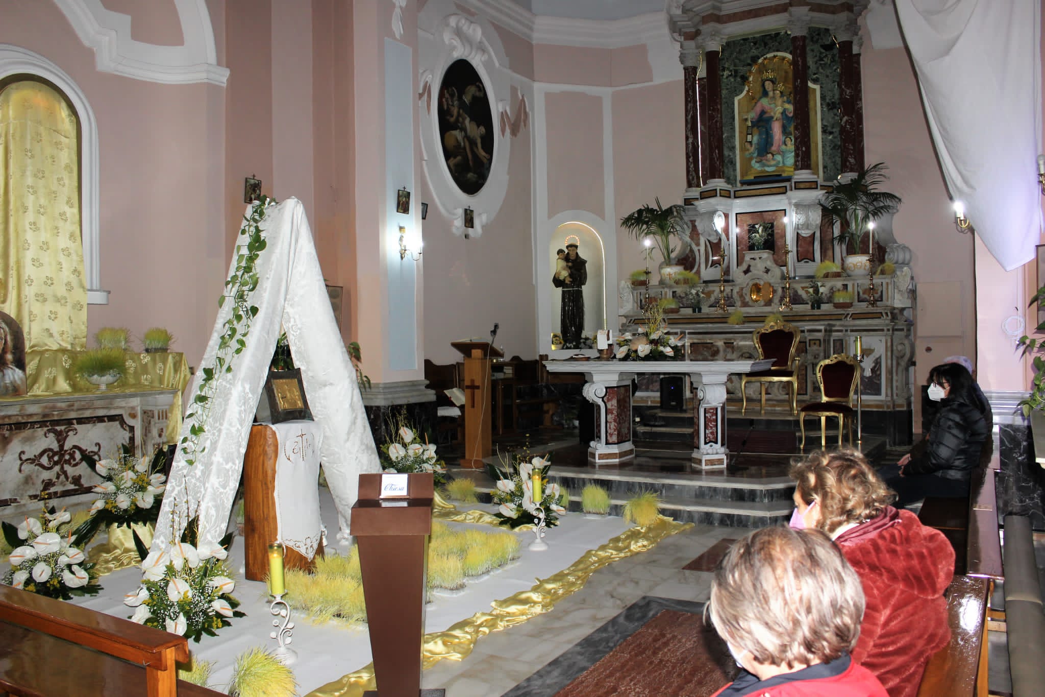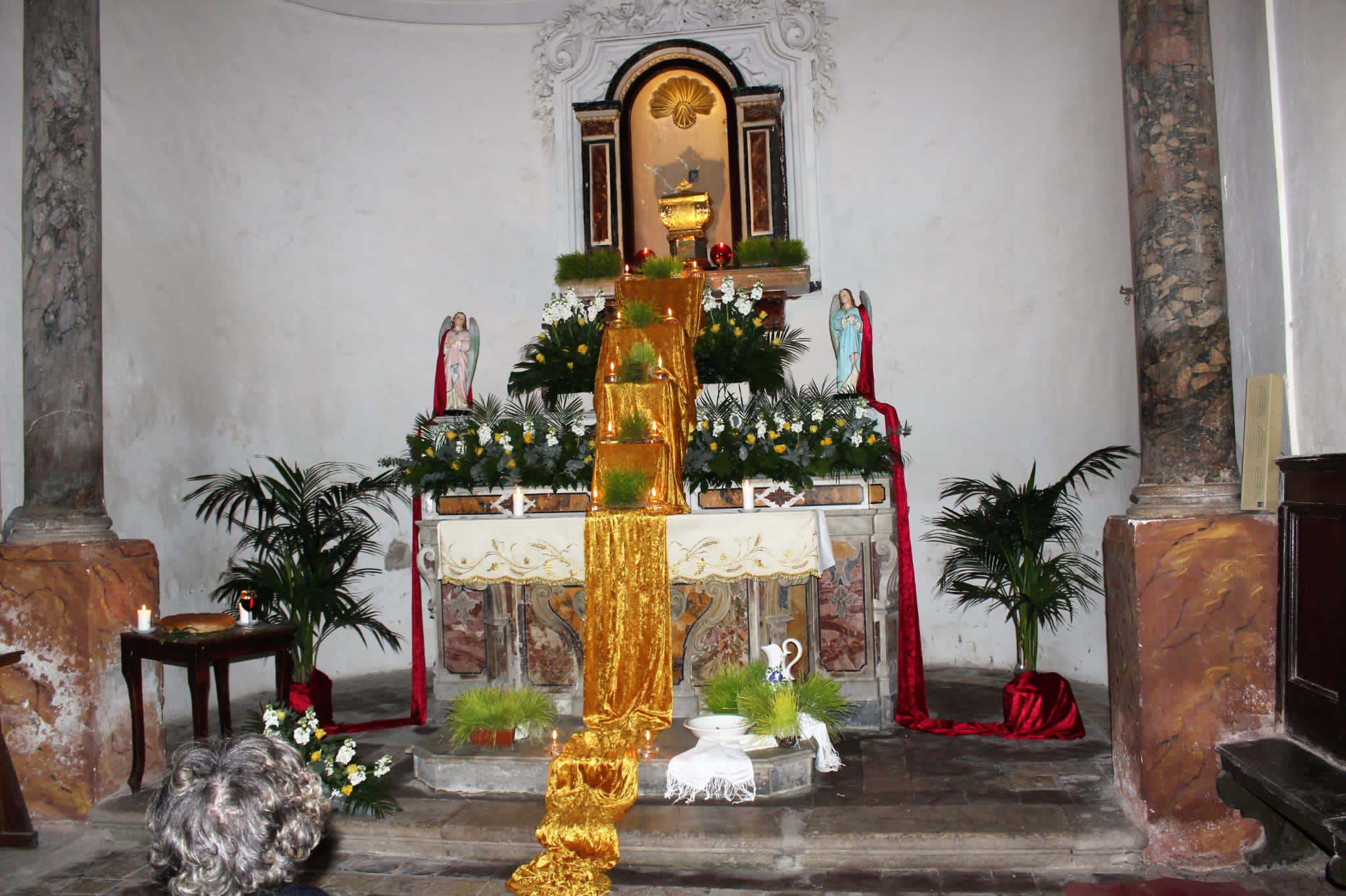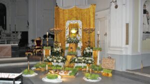 Per allestire gli Altari della Reposizione vengono usati addobbi tipici: grano germogliato, fiori, vino, incenso, pane, tendaggi e il Tabernacolo dove è posta l’Eucaristia.