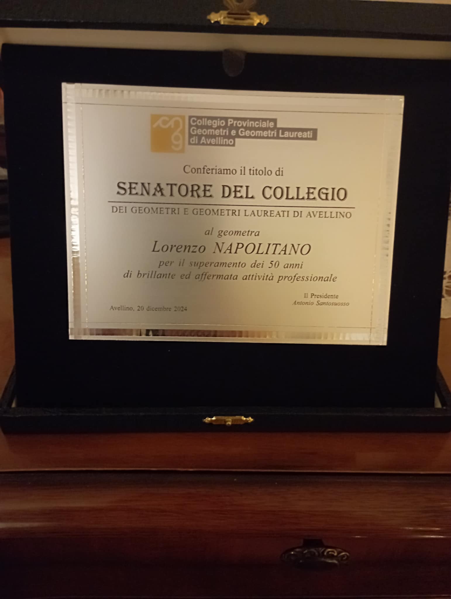 Il 20 dicembre 2024, il Collegio dei Geometri di Avellino ha reso omaggio a una figura che ha lasciato un segno indelebile nel territorio irpino: il Geometra Lorenzo Napolitano. Cinquant’anni di professione, mezzo secolo dedicato con passione, competenza e spirito di servizio alla sua comunità. Per celebrare questo importante traguardo, il geometra Lorenzo Napolitano è stato insignito di una targa che riconosce il valore del suo contributo professionale.