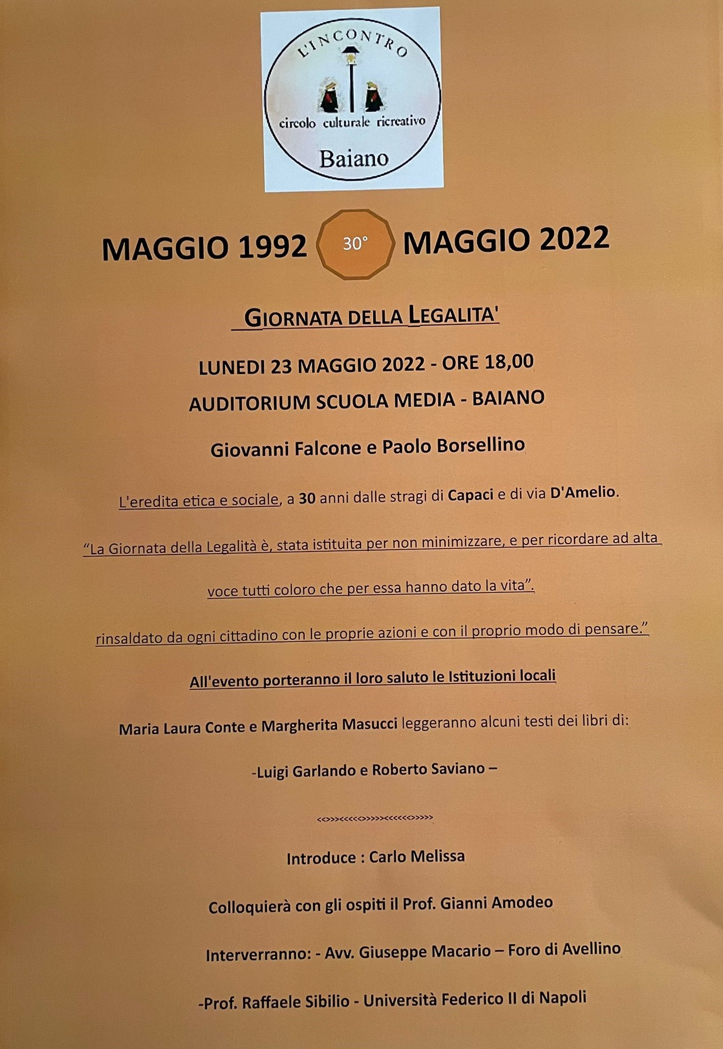 Presso l’auditorium delle Scuola Media di Baiano, lunedì 23 maggio 2022 alle 18, il circolo ricreativo culturale “L’incontro” sarà promotore di un dibattito sulla legalità a 30 anni dalle stragi di Capaci e via D’Amelio. Ad introdurre i lavori Carlo Melissa, interverranno il prof. Gianni Amodeo, l’avv. Giuseppe Macario, il prof. Raffaele Sibilio dell’Università Federico II di Napoli.