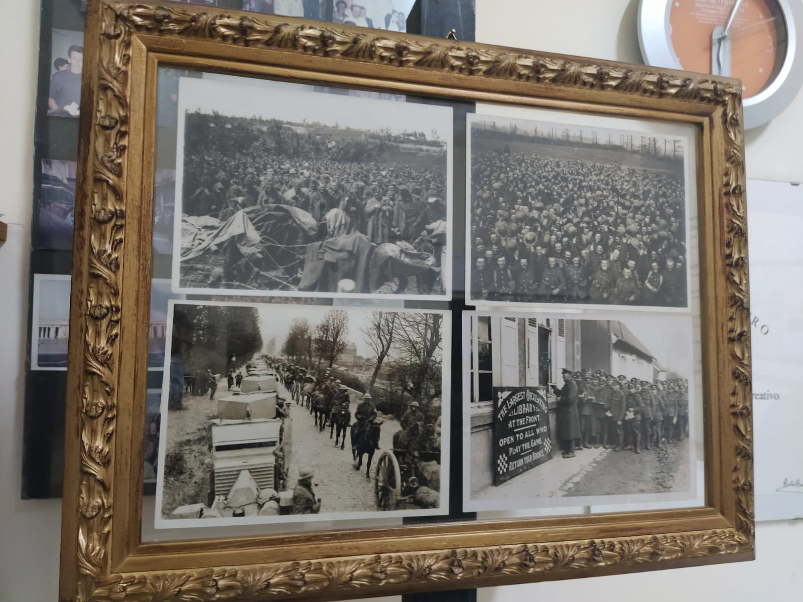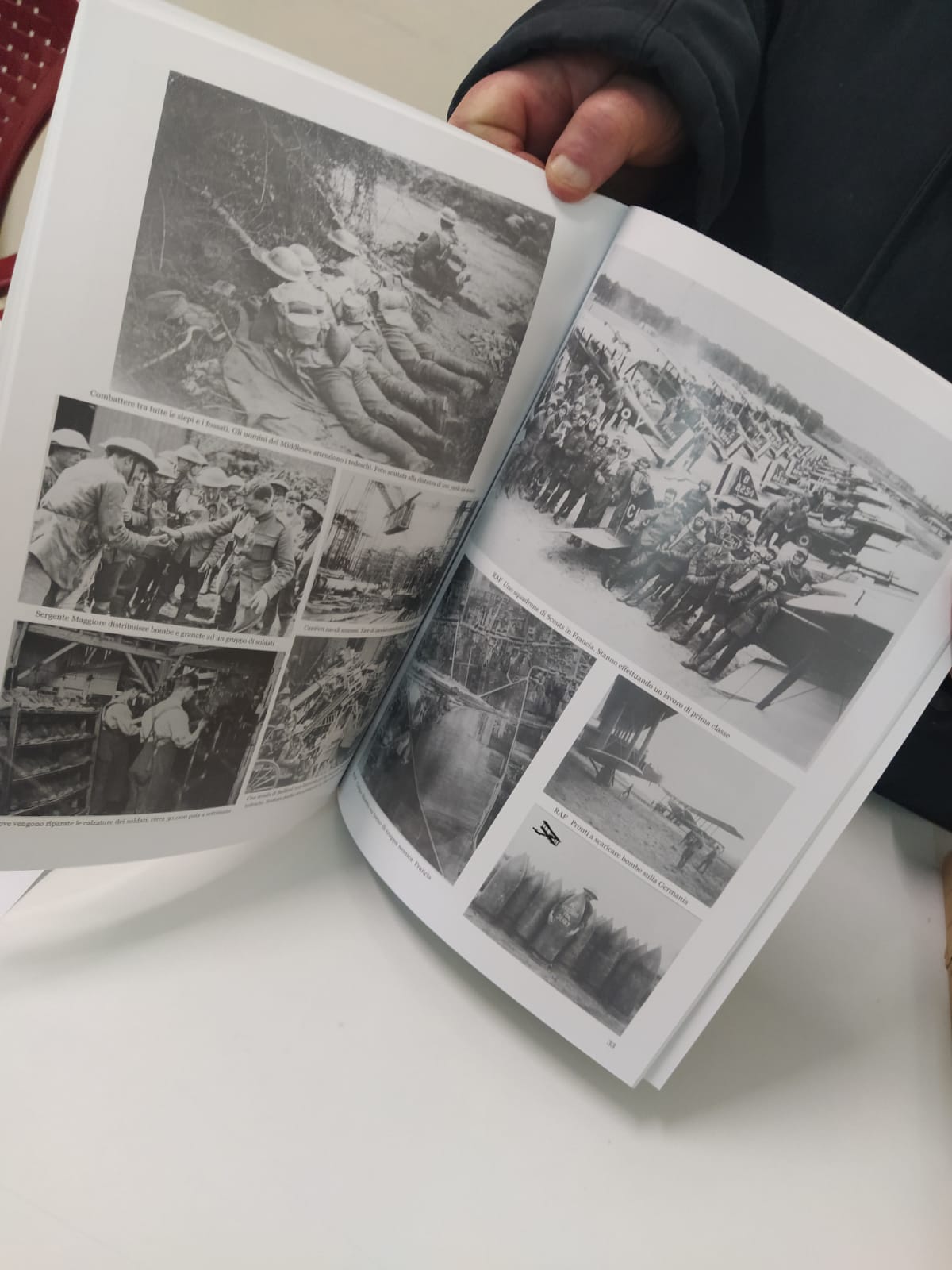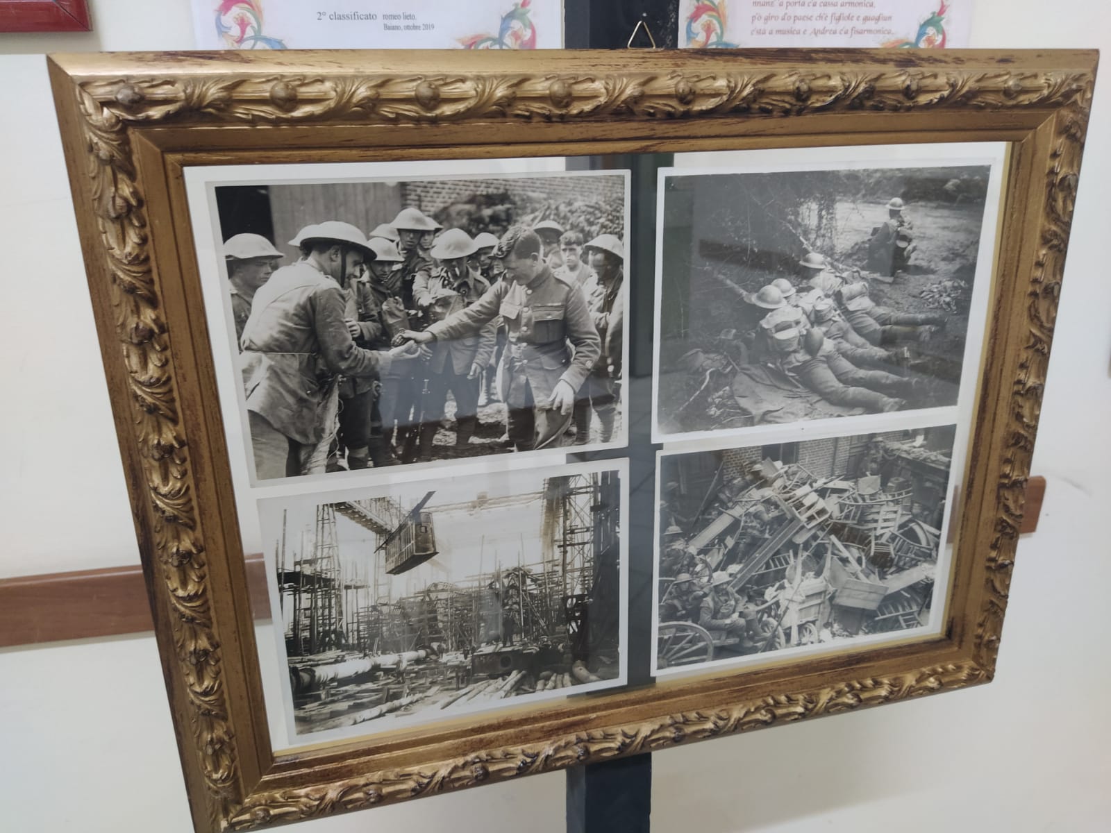 E’ la filiera di scena che si apre, a titolo di semplificazione, con la foto del fronte aperto in Mesopotamia dalle truppe della Gran Bretagna per il controllo strategico dei “territori e mari” con il “tesoro dell’oro nero”, la fonte della grande ricchezza economica e finanziaria del nostro tempo, ch’è anche il preannuncio di quella Guerra per l’energia da combustibile fossile che attraversa il primo ‘ 900, in cui competeranno le “Sette sorelle” e che prosegue con tanti attori e soggetti, oltre le “Sette sorelle” per quello che sono state; o la foto  dell’ospedale da campo, montato su un grande autocarro, con dotazione di farmaci e attrezzature che, tanto per dire, a nulla serviranno per impedire devastanti amputazioni e mutilazioni per i soldati colpiti da schegge di granata, con ferite che andavano rapidamente in cancrena e setticemia o contagiate da tentano per la scarsa igiene sia degli attrezzi sanitari usati dai medici stessi che di luoghi e ambienti di primo soccorso; o la foto della preparazione in medio – Oriente dell’ Amara Silversmith, che per tasso alcolico equivale al cognac, al cordiale, alla grappa, al vino, le cui dosi erano fornite e rese più abbondanti quasi a sostegno euforizzante ogni qual volta le truppe erano spedite all’assalto delle trincee e delle truppe nemiche; o la foto scattata sul fronte occidentale in Francia che rappresenta i soldati inglesi   davanti alla Libreria mobile, in attesa di restituire i libri letti.