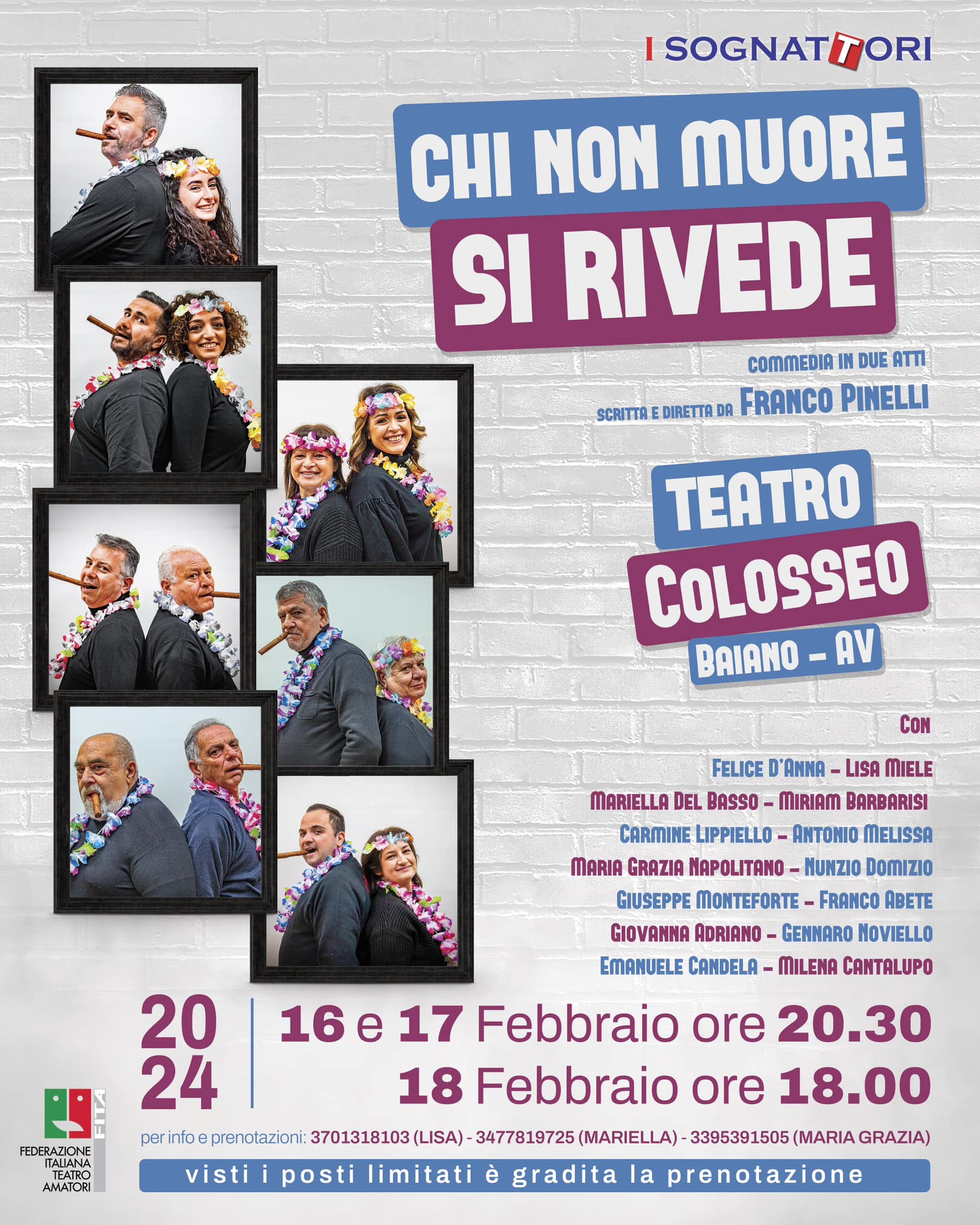 E’ l’ agile impianto narrativo di Chi non muore si rivede, la brillante commedia scritta da Franco Pinelli che ne ha curato la regia, autore di bella vena creativa, oltre che versatile attore attualmente impegnato nella tournèe di gran successo, di cui è protagonista la compagnia di Vincenzo Salemme in esibizione nei teatri delle più importanti città italiane per Natale in Casa Cupiello, con il più recente appuntamento inscenato qualche giorno fa al Sistina, a Roma. Un impianto, quello dei due atti della commedia di Pinelli, in cui I Sognattori si sono calati con fine sensibilità e ammirevole coralità espressiva in tre repliche, salutate dal pubblico del Colosseo con meritati applausi a scena aperta, per un pienone – rinnovato ancora una volta, per I Sognattori, come per Proteatro, L’ Aquilone, Mela e tante altre compagnie amatoriali e professionali. Un pienone, che ormai non va più letto e inteso quale specchio di pura e semplice fidelizzazione verso le proposte che mette in campo la struttura di via Marconi, ripristinata dopo oltre quaranta anni di … squallido abbandono, ma accompagna e favorisce anche la formazione e l’evoluzione del gusto e delle sensibilità culturali dello stesso pubblico, a due anni dallo stop all’emergenza pandemica. Un bel passo in avanti per un proficuo input nella circolazione delle idee, concorrendo, nello stesso tempo, allo sviluppo del discorso pubblico per le comunità del territorio.
