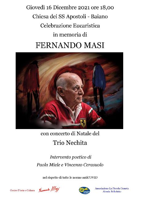 Sarà officiata nella Chiesa dei Santi Apostoli, la celebrazione eucaristica del trigesimo in omaggio a Fernando Masi, il versatile e poliedrico artista, che con l’immediatezza del linguaggio della pittura ha interpretato e raccontato in una miriade di opere l’anima del territorio con le sue fatate atmosfere paesaggistiche e naturalistiche, tra le quali lemme e quasi annoiato scivola l’antico Clanio, nella cornice dei Monti Avella e del Partenio. Un composito racconto di colori, che vive di volti e stilizzati profili di gente comune, fatto, per di più, conoscere e veicolato non tra le quattro mura di casa nostrana, bensì in Italia e all’estero, con importanti opere presenti in Pinacoteche pubbliche e istituzionali, oltre che in collezioni artistiche private.
