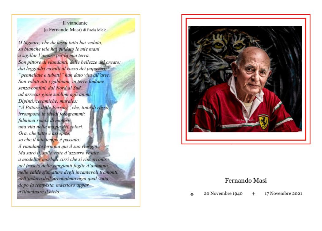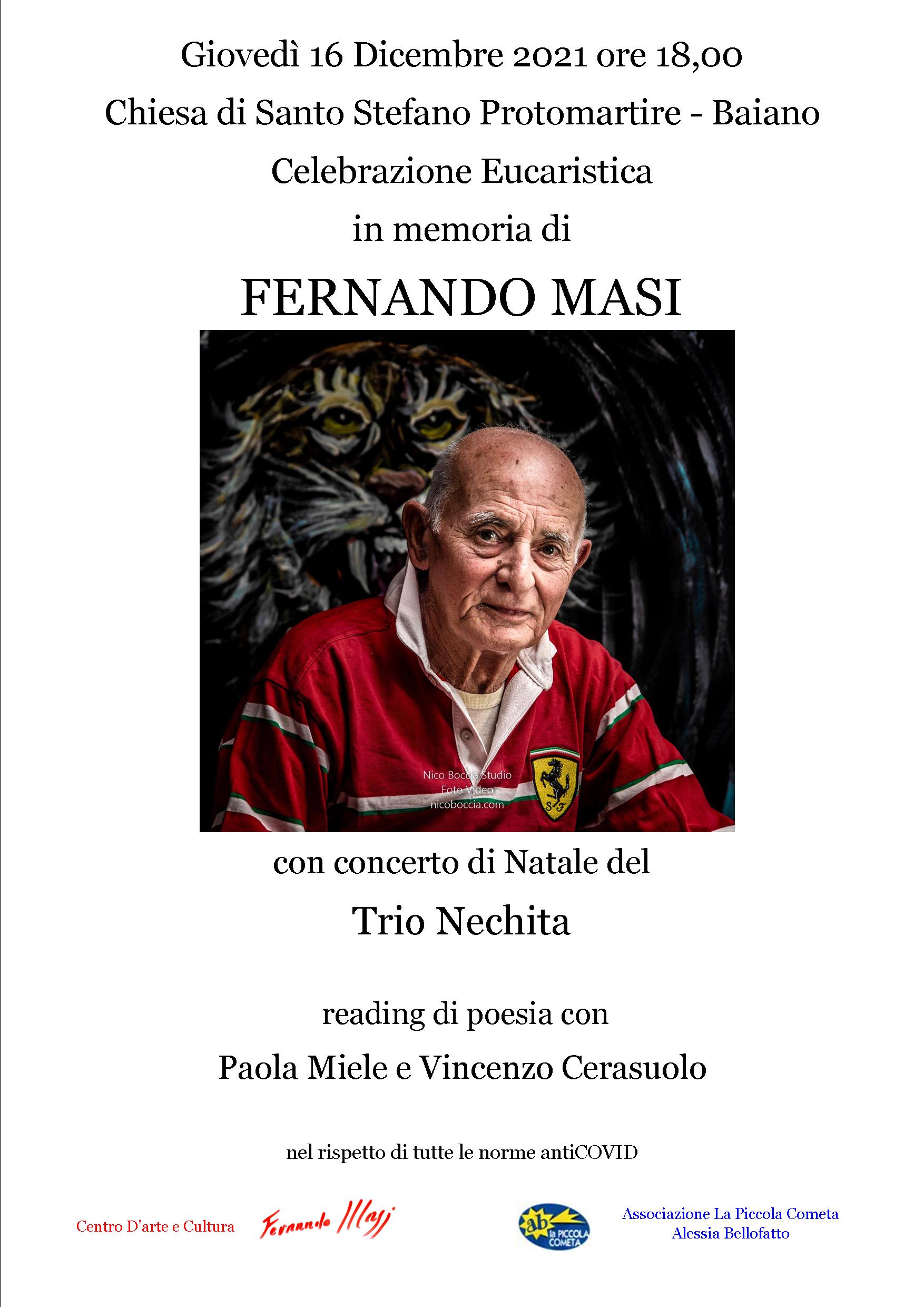 Sarà officiata giovedì- sedici dicembre, alle 18,30– nella Chiesa parrocchiale di Santo Stefano Protomartire, la celebrazione eucaristica in memoria di Fernando Masi, il poliedrico artista che se n’è andato circa un mese fa. E’ il ricordo che s‘accompagna al caldo ed affettuoso saluto resogli, qualche settimana fa, nell’Incontro, aprendo il Forum di analisi storica e approfondimenti critici dedicato all’eccezionale nel Collezione fotografica sulla prima guerra mondiale, unica nel genere memoriale con foto ufficiali provenienti da tutti i Fronti del conflitto del ‘14\18 e realizzata da Pantaleone Dentice, imprenditore con sensibilità d’artista e amico prediletto dell’artista; saluto affidato alla proiezione del filmato a colori, che rivisita con la scansione del sonoro aspetti e profili dell’ intensa e rilevante produzione pittorica di Tonino \ Fernando, con testimonianze presenti in spazi pubblici e istituzionali nazionali ed esteri, oltre che in Murales, e nelle abitazioni degli amatori delle peculiari specificità dell’ arte e della creatività altamente espressiva di Masi.