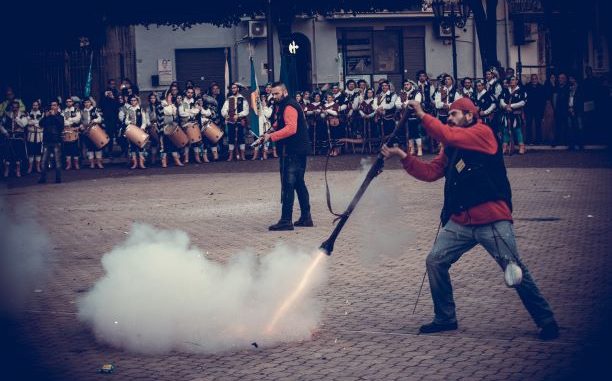 In mattinata, erano protagonisti della sfilata lungo corso Garibaldi e delle performance di spari a salve di carabine e tromboni rivolti in basso o verso la bronzea aquila svettante sul Monumento dei Caduti in guerra, mentre di pomeriggio e fino a sera hanno trasformato piazza Francesco Napolitano nel palcoscenico delle loro spettacolari esibizioni, attraversate dall’acre e pungente odore della polvere da sparo dispersa in aria dai colpi esplosi da carabine, schioppi e fucili verso il cielo; esibizioni, magicamente ingentilite e ravvivate dalle piacevoli armonie delle squillanti chiarine e dei rulli dei tamburi, in sintonia con i passi cadenzati dei trombonieri e fucilieri – tutti impettiti nei loro costumi d’epoca indefinibile e incerta, ma di sicura fattura più o meno guascona, con colori sgargianti e cappelli a forma conica di larga falda, impennacchiati da bianche piume al vento- a seconda delle posizioni geometriche e delle coreografie che gradualmente venivano disegnando sui “sampietrini” della piazza, con il prezioso racconto illustrativo, reso dalla voce narrante di Giusy De Laurentiis.