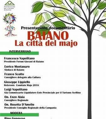 Sabato 25 marzo alle 18 presso la sala consiliare del Comune di Baiano ci sarà la presentazione del documentario: “Baiano, la città del Maio”. Interverranno alla manifestazione il sindaco di Baiano Enrico Montanaro, l’assessore Franco Scotto, il presidente del Forum Giovanile Francesco Napolitano, il referente del Comitato Maio 2016 Giuseppe Lippiello, il già Commissario Liquidatore dell’Ente Provinciale per il Turismo Luigi Napolitano, l’on Enzo Alaia consigliere Regionale, nonché la presidente del Consiglio Regionale Rosetta D’Amelio. A moderare l’incontro il giornalista Rai Rino Genovese.
