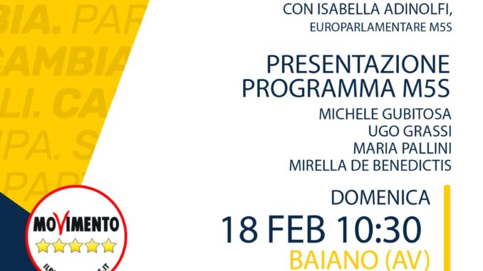 Saranno in paese domenica mattina presso la sala consiliare del comune i candidati del Movimento 5 Stelle per partecipare ad un incontro pubblico dal tema: Politiche agricole e sviluppo regionale. Prenderanno parte all’incontro Michele Gubitosa, Ugo Grassi, Maria Pallini e Mirella De Benedictis.