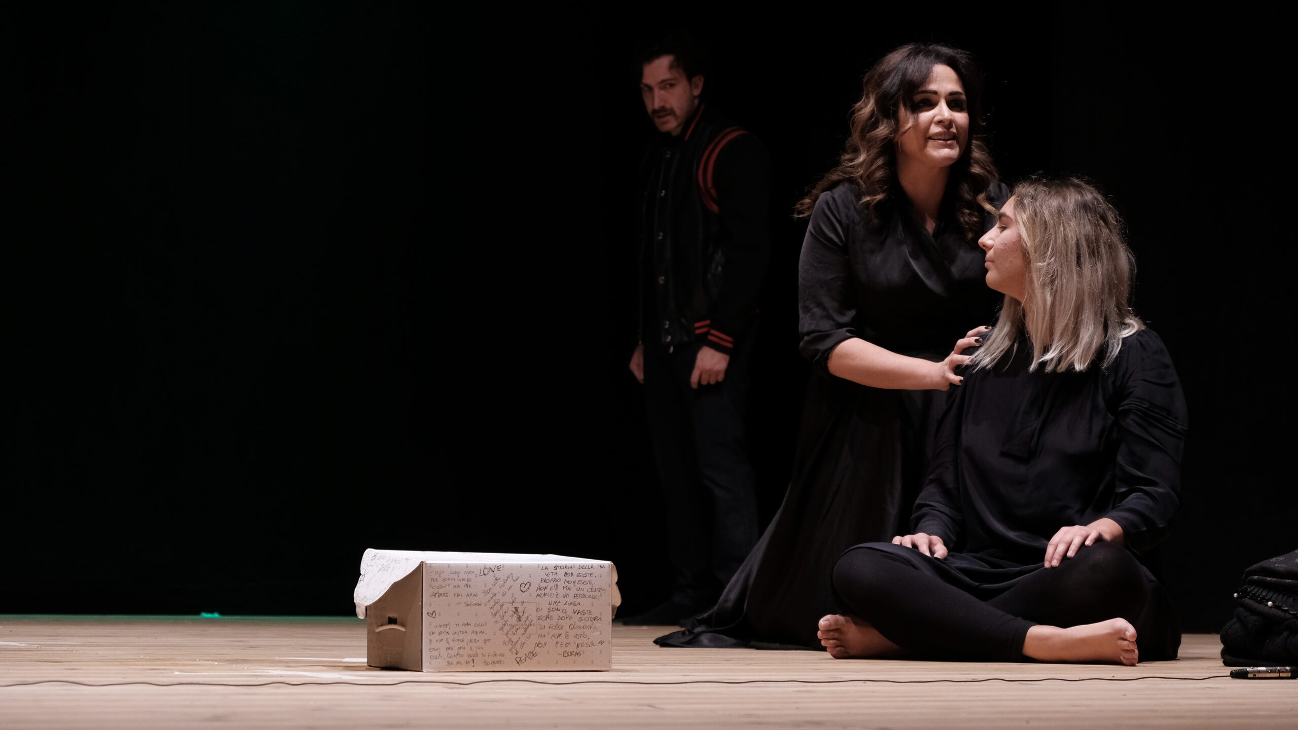 E’ il dato, a cui si rapporta il movimento scenico, affidato al ripetuto messaggio radiofonico che annuncia l’ennesimo sbarco a Lampedusa di barconi e navi-carrette con il loro carico di umanità migrante. E’ il movimento rappresentativo di tempi recenti, segnati dalla frequenza dei flussi migratori, che catalizza l’ Europa del benessere, ed ora in affanno. Una realtà amara e di sofferenza, al centro del dialogo sviluppato da osservatori che s’interrogano sul fenomeno delle migrazioni nella società globalizzata; dialogo ad alta e incalzante tensione dialettica, così com’ è caratteristica dei giovani, animato da Angela D’ Apolito e Antonio Lippiello, con Ester Ruotolo, che dà voce, sentimenti e riflessioni alla donna eritrea nell’ analisi della sua dura condizione di migrante.