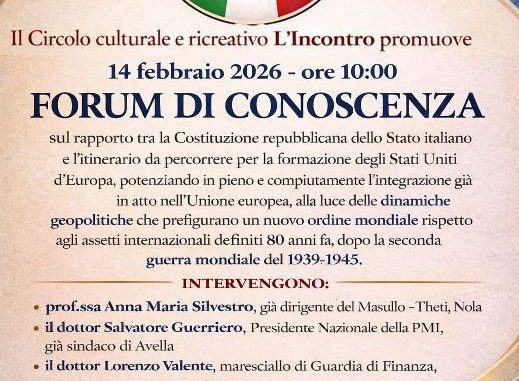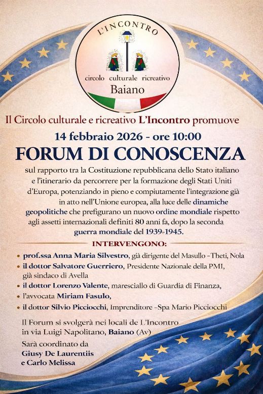 Un momento di riflessione culturale e confronto sui grandi temi dell’attualità istituzionale e geopolitica. È in programma sabato 14 febbraio 2026 alle ore 10:00, presso la sede del circolo in via Luigi Napolitano a Baiano, il Forum di conoscenza organizzato dal Circolo culturale e ricreativo L’Incontro.