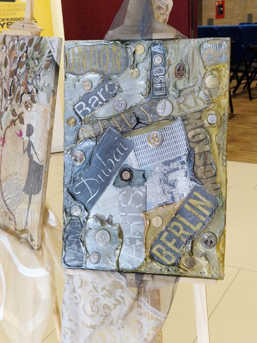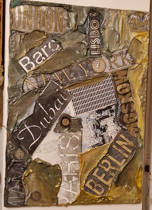 Opere da ammirare e parlanti, variando dal genere figurativo di luminosi volti di donne e nitidi profili umani a quello dei bei paesaggi montani e di alberi con corolle chiomate che si aprono al cielo libero, come per atteggiare e configurare la dimensione cosmopolita, in cui si rincorrono in un gioco ad incastro e di voluta commistione i cartelli identificativi di Paris, Barcellona, Berlin, London, Dubai e così viaggiando sulle ali della fantasia. E’, quello elaborato dall’artista, il virtuale giro del mondo che diventa sempre più angusto Villaggio, attraversato com’è dalle reti della super veloce comunicazione elettronico- informatica a maglie sempre più strette e stringenti, tra le quali rimbalza frenetica e caotica la sarabanda di news e fake news.